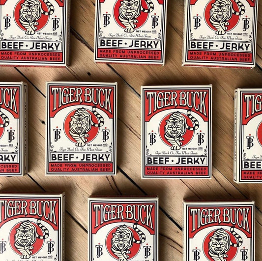 Tiger Buck Beef Jerky 40gm – bold, smoky and packed with protein. Premium Aussie beef, slow dried for rich flavour and the perfect on-the-go snack.